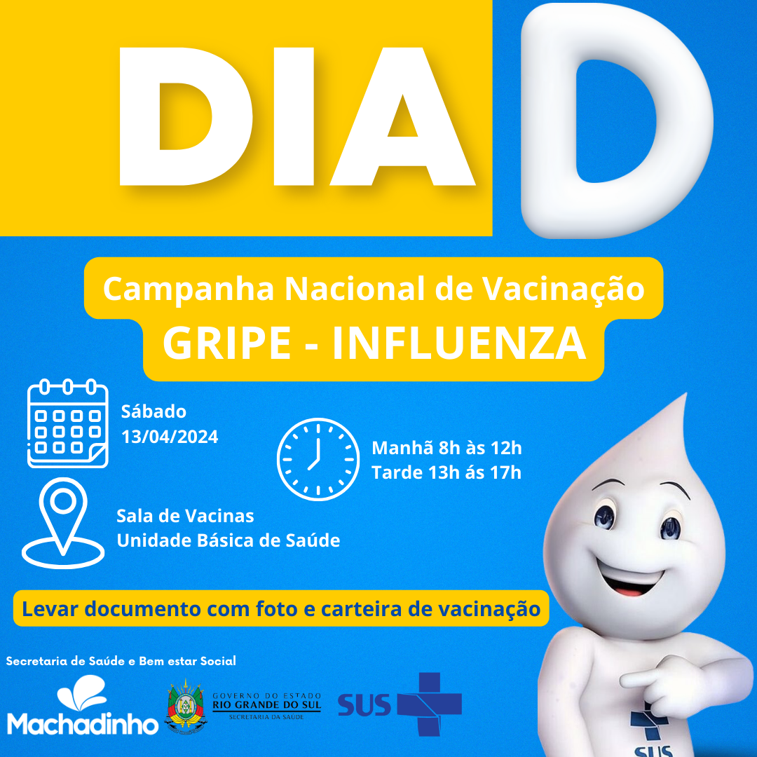 O Dia D de vacinação contra a Gripe – Influenza representa uma oportunidade valiosa para a comunidade de Machadinho, RS, se proteger contra esse vírus sazonal, garantindo a saúde e o bem-estar de todos os cidadãos. Compareça e faça parte desse movimento pela prevenção!