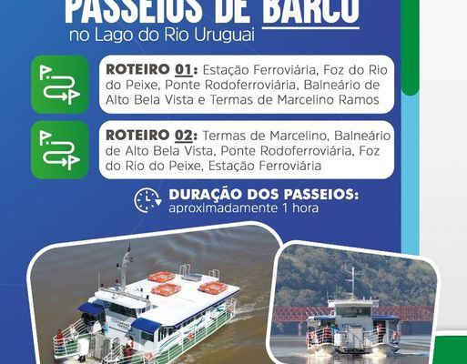 O Catamarã Termas, foi especialmente projetado, com tecnologia e equipamentos de ponta, devidamente licenciado e documentado, através dos órgãos competentes, para realizar passeios turísticos em Marcelino Ramos; com total segurança e conforto, onde os passageiros irão apreciar, as belezas e as paisagens, da divisa dos estados do Rio Grande do Sul e Santa Catarina.
