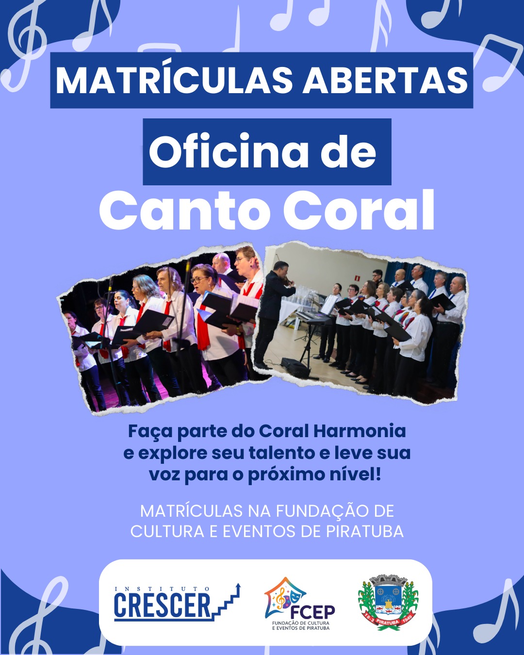 A Fundação de Cultura e Eventos de Piratuba está com as matrículas abertas para a oficina de Canto Coral. A atividade é uma oportunidade para quem deseja desenvolver suas habilidades musicais, explorar o talento vocal e integrar o Coral Harmonia, grupo tradicional do município.