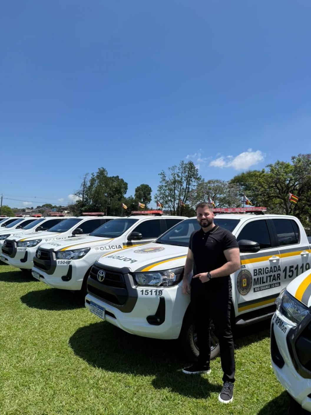 Na terça-feira, 18 de novembro, o prefeito André, a secretária Mônica e os vereadores Negueto e Póca estiveram em Porto Alegre participando da cerimônia oficial de entrega de novas viaturas destinadas aos municípios do Rio Grande do Sul. O evento ocorreu na Academia de Polícia Militar, reunindo autoridades estaduais e representantes de diversas cidades.
