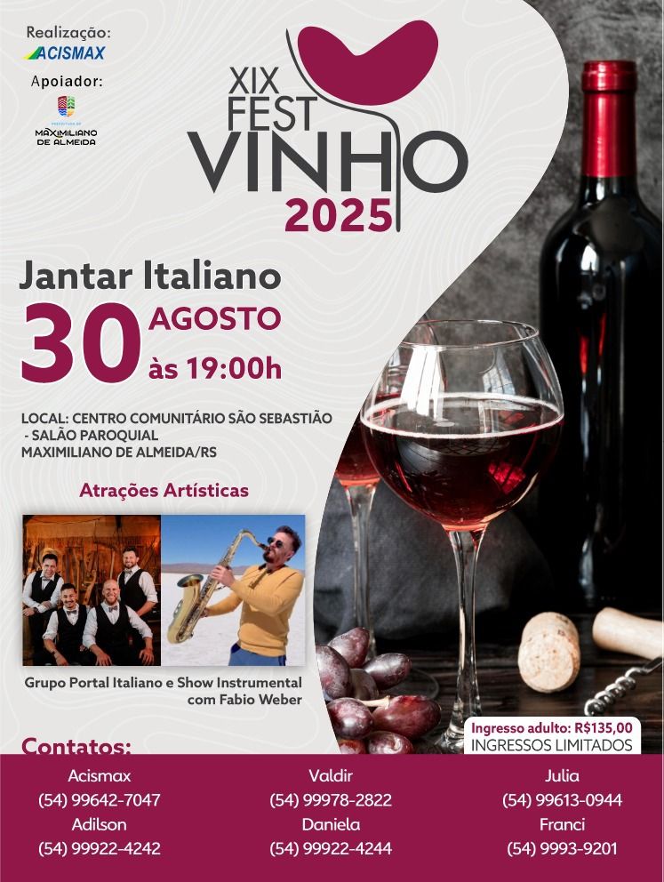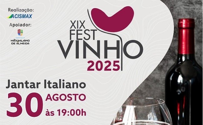 Vem aí o 19º Fest Vinho 2025, um dos eventos mais aguardados de Maximiliano de Almeida. No dia 30 de agosto, às 19h, o Salão Paroquial do Centro Comunitário São Sebastião será palco de um tradicional jantar italiano, reunindo sabores, cultura e música em uma noite especial.