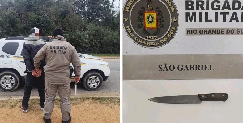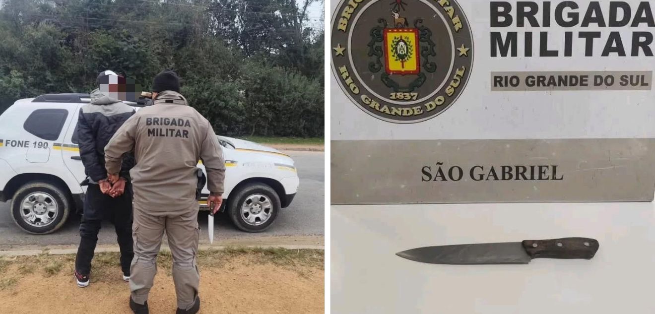 Durante patrulhamento da Operação Fecha Quartel Escola Segura, policiais militares abordaram um adolescente de 15 anos em atitude suspeita nas proximidades da escola CAIC, em São Gabriel/RS. Com ele, foi encontrada uma faca de aproximadamente 20 cm de lâmina.