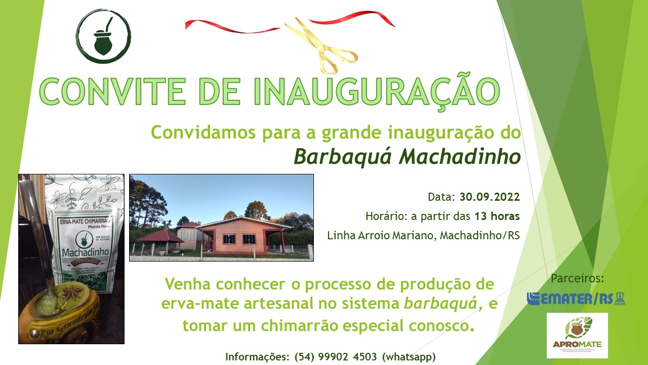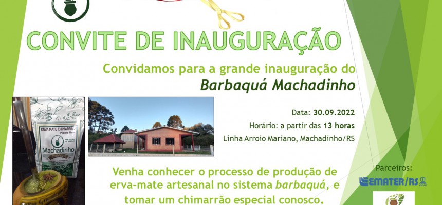 Neste dia 30 de setembro, as 13h00m, acontecerá a inauguração do Barbaquá Machadinho. Sendo assim, o mais breve possível, você também poderá adquirir esta novidade do mate, nos supermercados de sua cidade.
