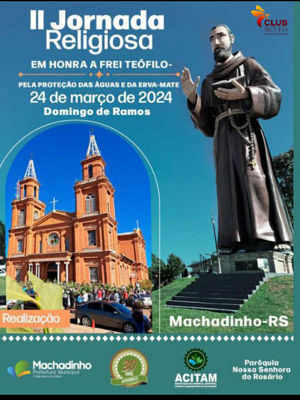 A 2ª Jornada Religiosa em Honra a Frei Teófilo – Pela proteção das Águas e da Erva-Mate é uma realização da Prefeitura Municipal de Machadinho, APROMATE, ACITAM e Paróquia Nossa Senhora do Rosário.