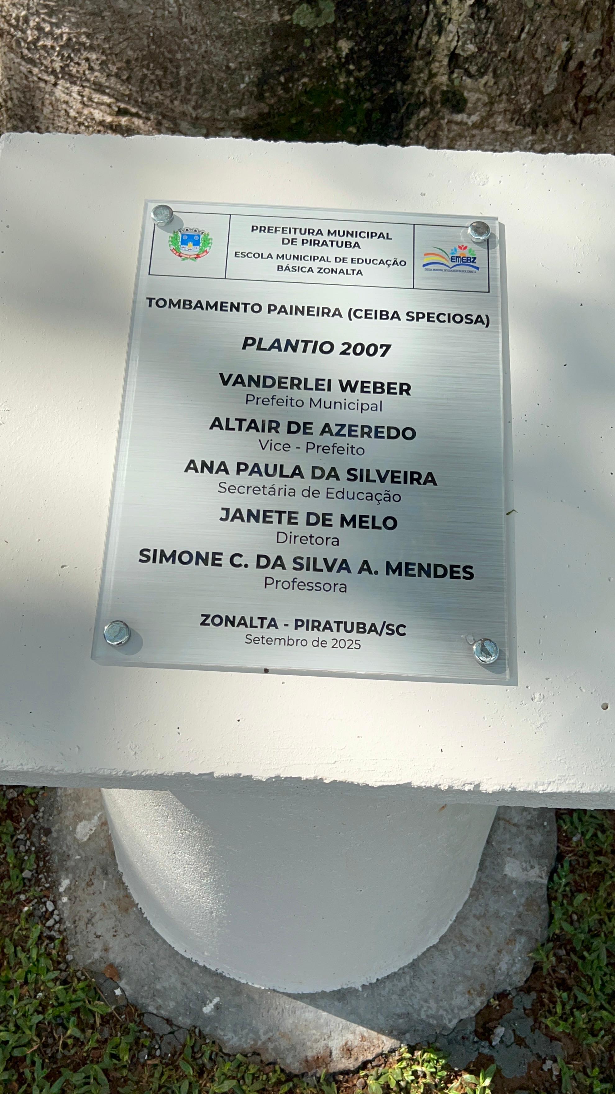 Na tarde de segunda-feira (22), às 14h30, a comunidade escolar da Escola Municipal de Educação Básica de Zonalta, em Piratuba, viveu um momento histórico com o ato oficial de tombamento da Paineira existente no pátio da instituição. A árvore, que há muitos anos faz parte do cotidiano de alunos, professores e moradores da região, foi reconhecida como símbolo de memória, identidade e patrimônio natural e cultural da comunidade.