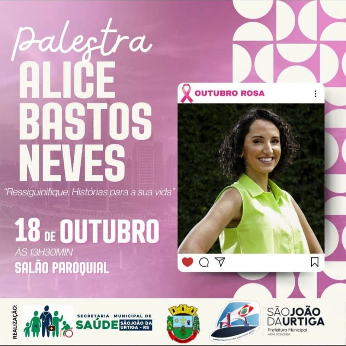 A Prefeitura Municipal, em parceria com a Secretaria da Saúde, convida todas as mulheres para uma tarde especial com Alice Bastos Neves, jornalista da RBS TV, conhecida por sua história de superação e motivação.