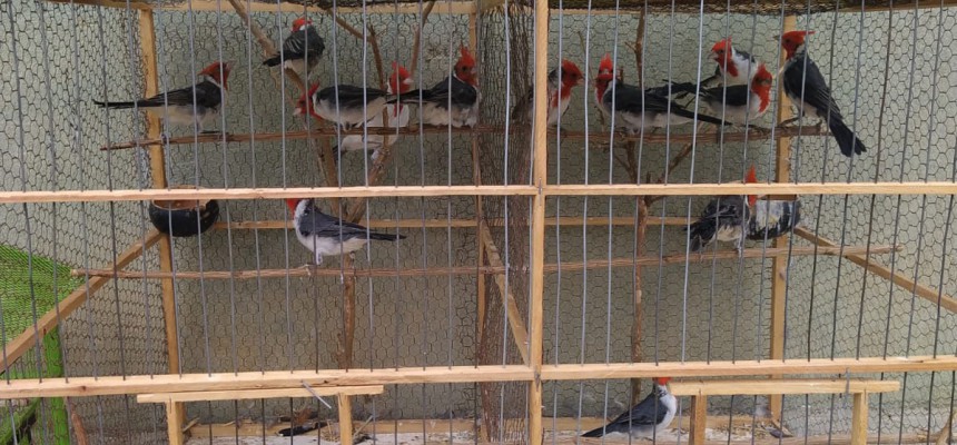 No endereço mencionado na denúncia, foram localizados 21 pássaros cardeais (Paroaria coronata) e 2 Azulões (Cyanocompsa spp) presos em pequenas gaiolas.