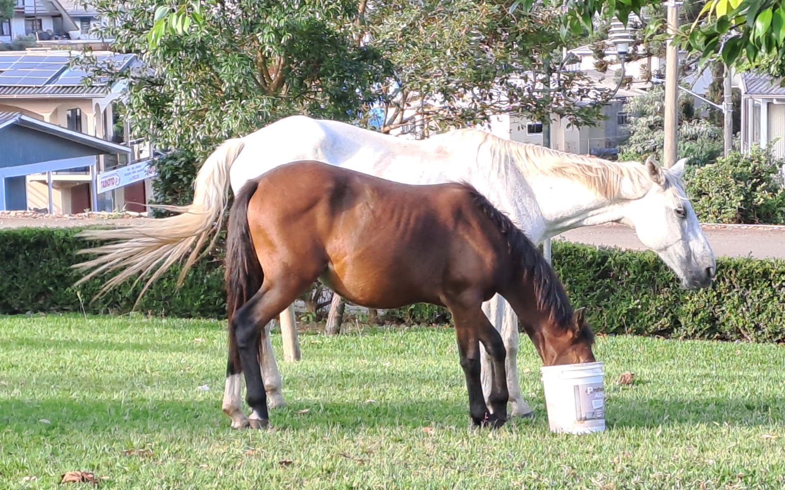 Os dois cavalos resgatados, uma potrinha colorada e um tordilho macho castrado, estavam extremamente ariscos, o que tornou a captura uma tarefa árdua. Além disso, estavam visivelmente famintos e sedentos, o que evidencia o abandono a que foram submetidos.