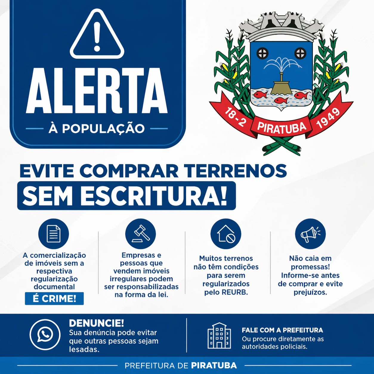 A orientação é clara: antes de adquirir qualquer imóvel, o cidadão deve verificar se há escritura pública e registro em cartório, além de buscar informações junto aos setores competentes da Prefeitura.