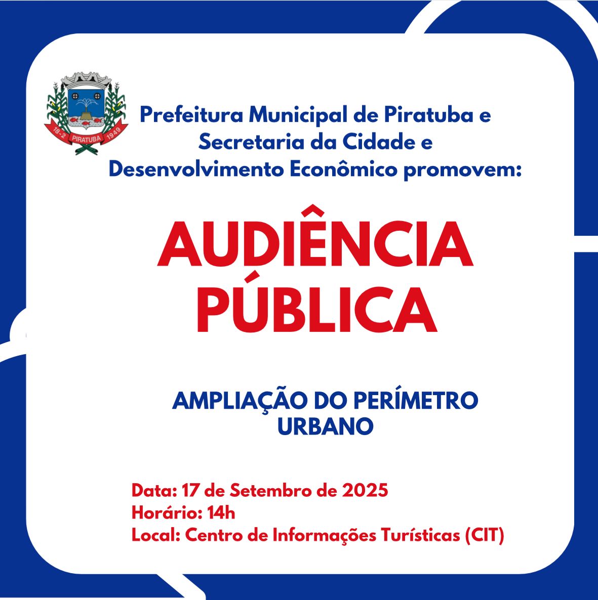 O Município de Piratuba, Estado de Santa Catarina, por meio do Prefeito Municipal, no uso de suas atribuições legais e em cumprimento ao disposto na legislação urbanística e de planejamento municipal, torna público e convida a comunidade em geral, entidades representativas e interessados para participarem da Audiência Pública que tratará da expansão do perímetro urbano em parte de área localizada no Bairro Verde, nesta municipalidade.