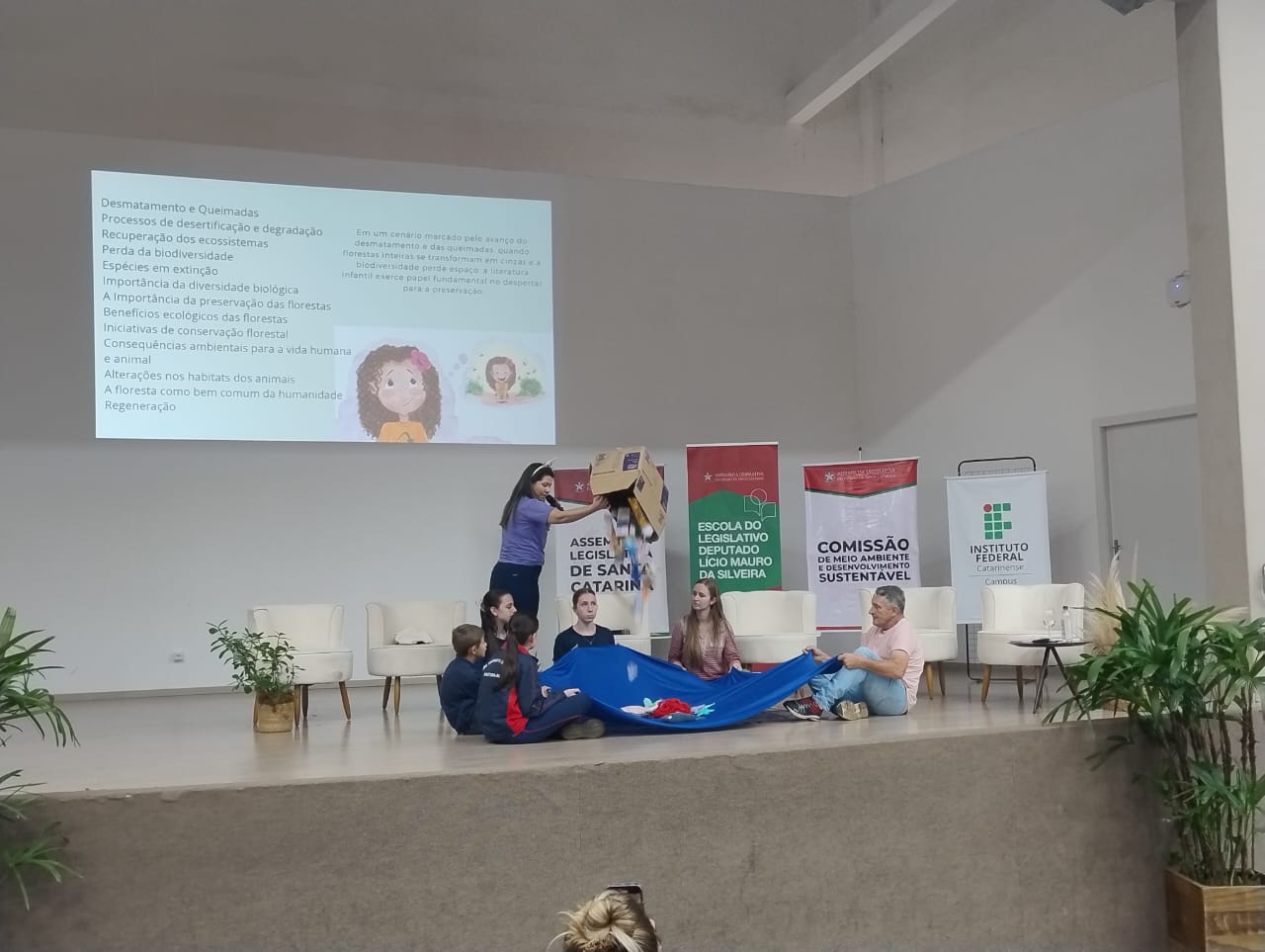 – Professora Fabiana Nogueira C. Mina, criadora do projeto Escolas Lixo Zero – Pedagogia da Autonomia, apresentou práticas, materiais produzidos e realizou uma encenação sobre o problema do lixo nos oceanos, com a participação dos alunos.