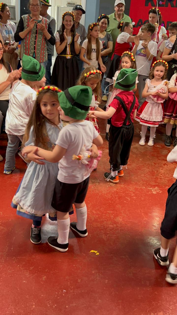 Após o bate-papo, foi servido um lanche típico do Kerb, com cuca e linguiça. Em seguida, alunos e convidados dançaram músicas tradicionais, e houve a retirada das bonecas da coroa de flores, confeccionadas pelos próprios estudantes — um dos momentos mais especiais da tarde.