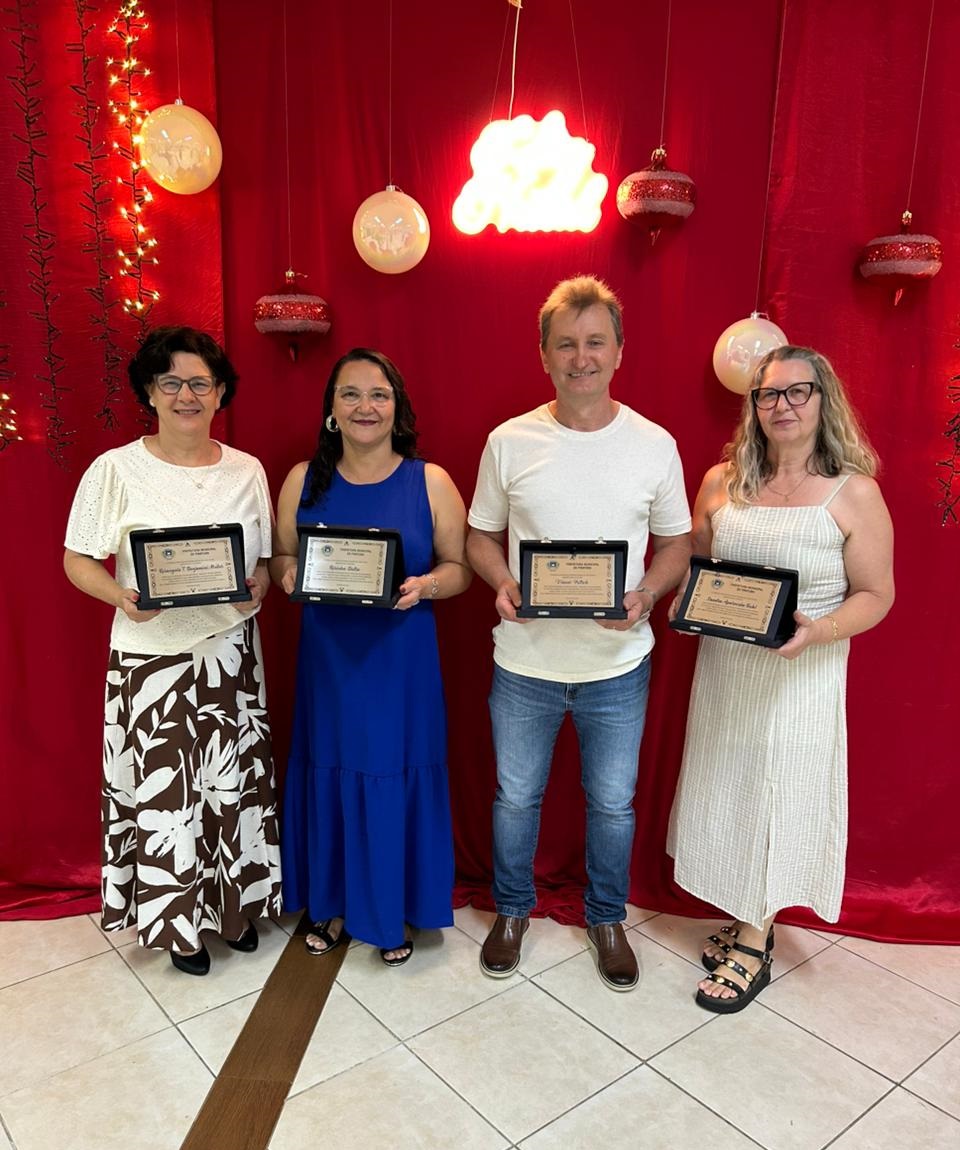 Foram homenageados os servidores Rosinha Dutra, Vianei Fritsch, Rosangela T. Benjamini Muller e Sandra Aparecida Buhl.
