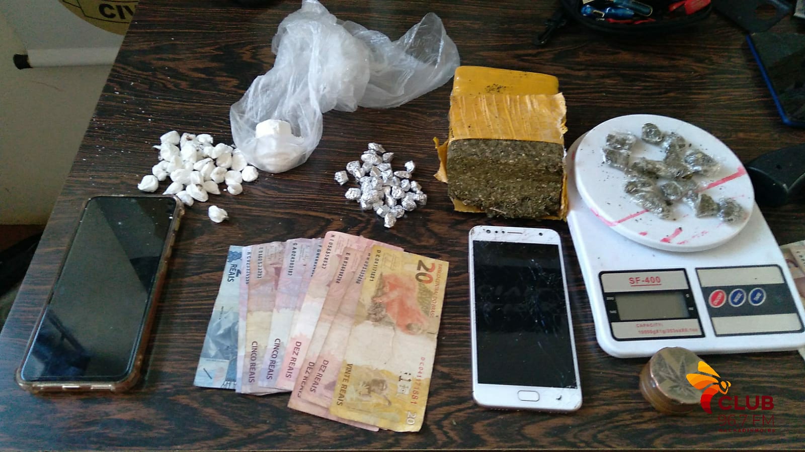 Em virtude das apreensões, um homem e uma mulher, foram autuados em flagrante por tráfico de drogas. Foram apreendidos: cocaína, crack, maconha, dinheiro, simulacro (arma de brinquedo), espingarda, balança de precisão e diversos pen drives e celulares que serão todos periciados em busca de possíveis crimes, delitos e demais pessoas envolvidas.
