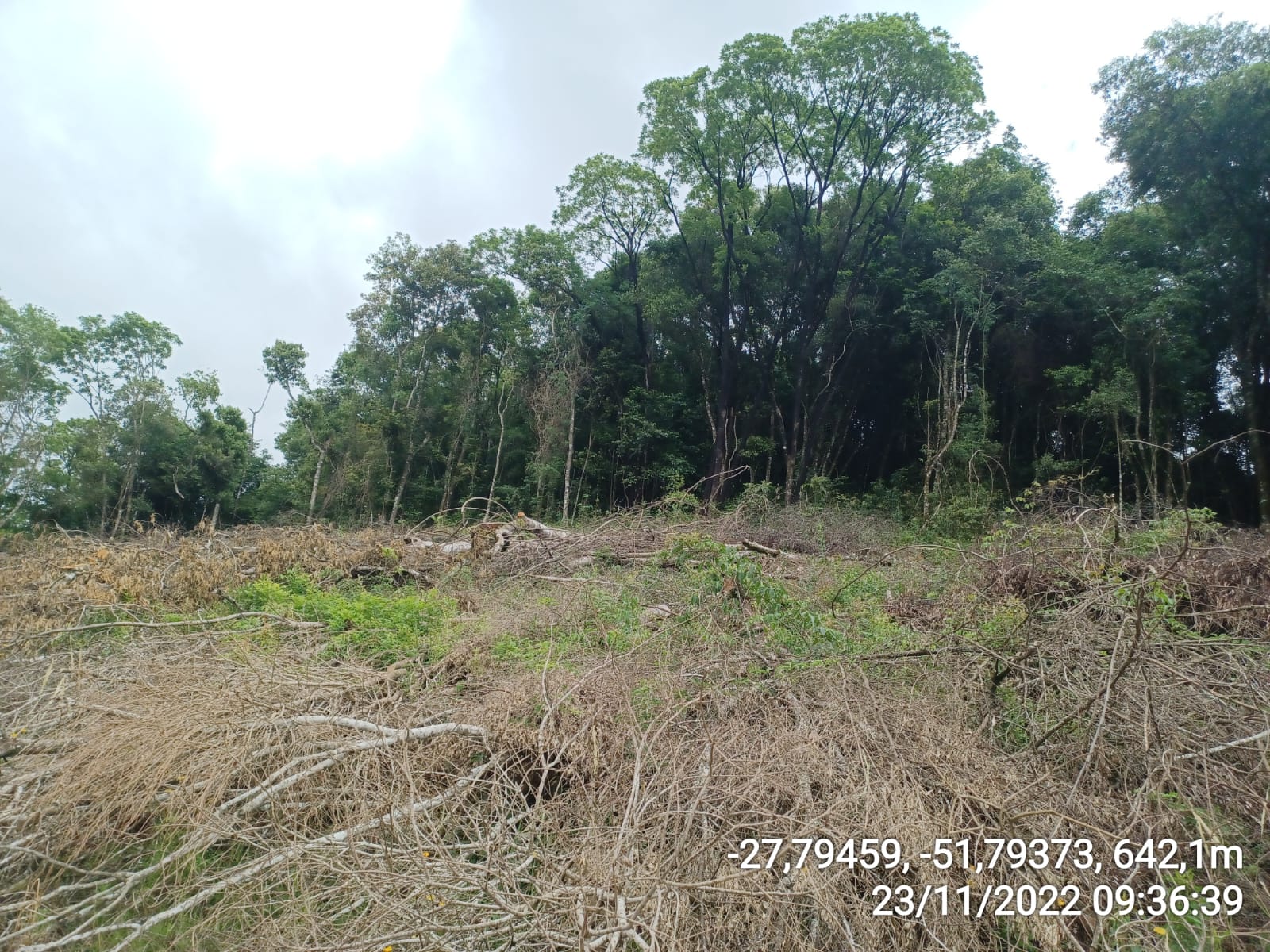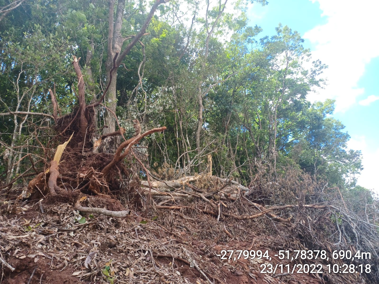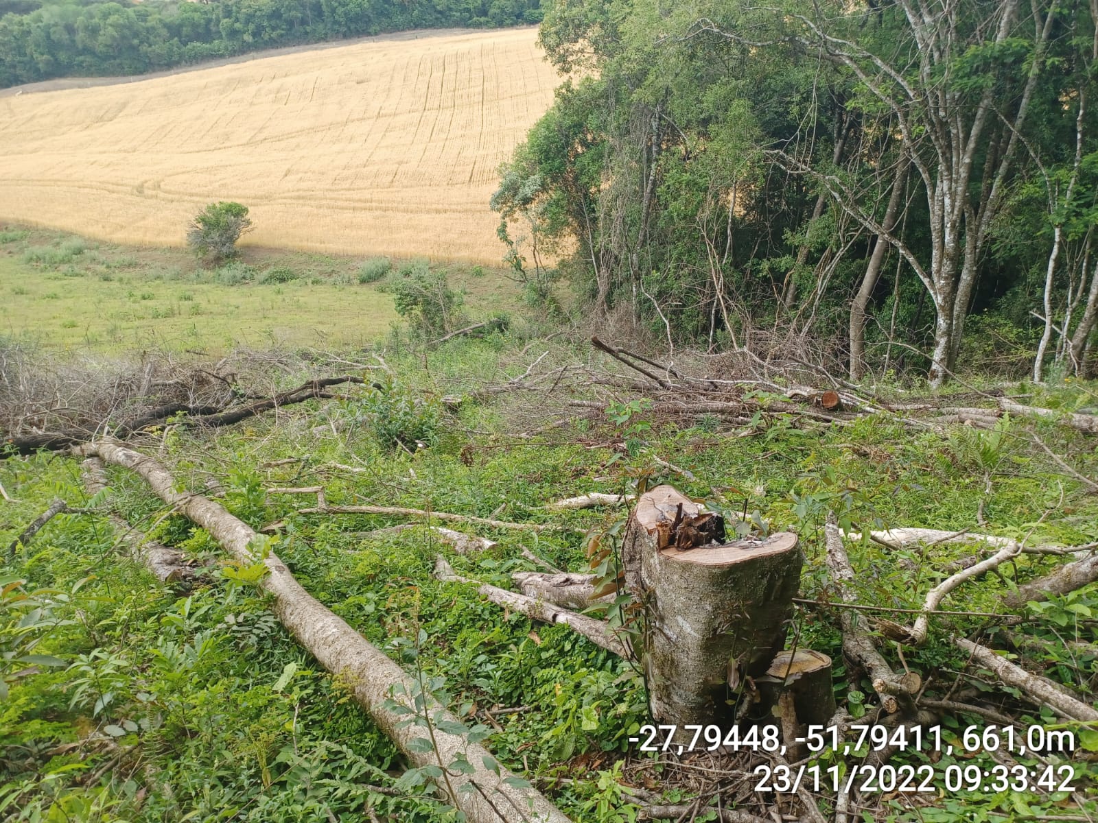 Os policiais militares, flagraram a supressão de vegetação nativa, em estágio avançado de regeneração em uma área de 0,12 Hectares (1.200 m²), pertencente ao Bioma Mata Atlântica, atingindo espécies como: Cedro, Canela, Açoita-cavalo, timbó, entre outras, sem licença do órgão ambiental competente.