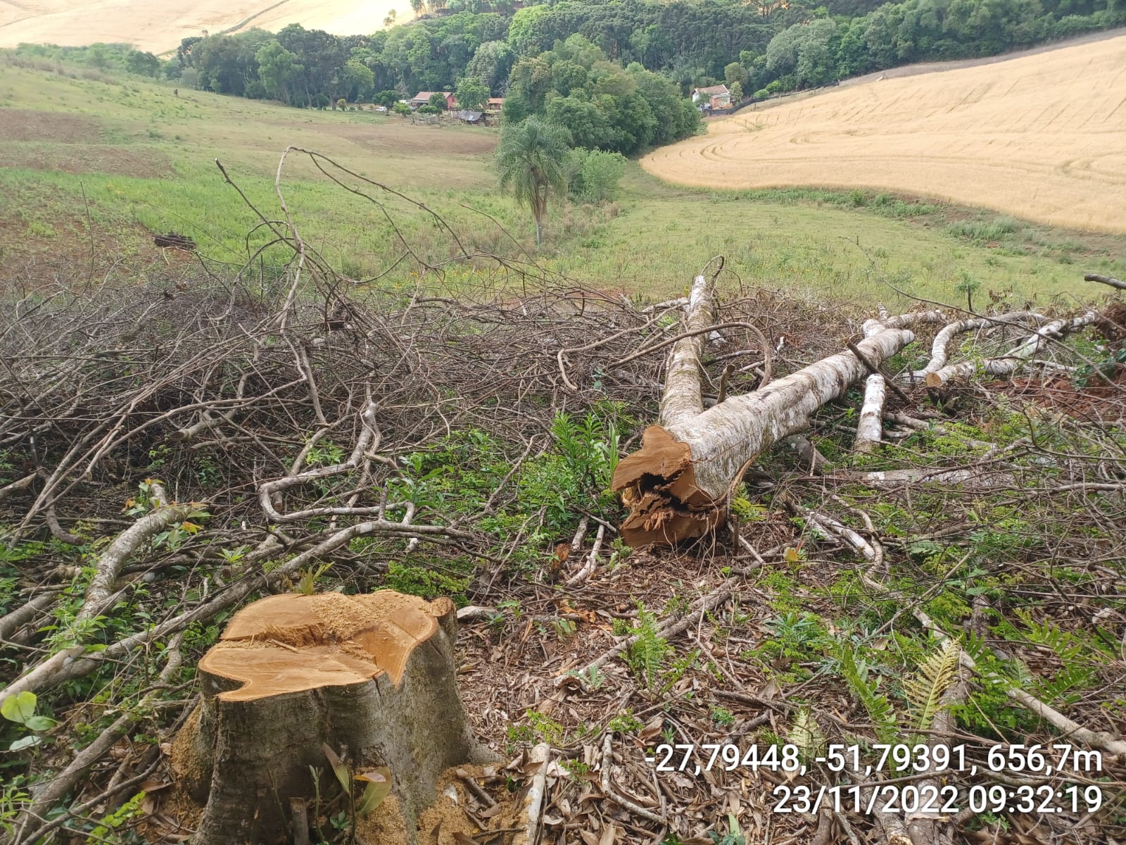 Ainda, na mesma data e na Linha Cadore, os policiais militares flagraram a supressão de vegetação nativa em estágio avançado de regeneração em uma área de 3,63 Hectares (36.300 m²), pertencente ao Bioma Mata Atlântica, conforme vegetação remanescentes foram suprimidas espécies como Cedro, Canela, Açoita-cavalo, timbó, entre outras. O responsável pela área não foi localizado, será elaborada nova diligência a fim de identificação do responsável, o qual responderá pelo crime contra a flora.