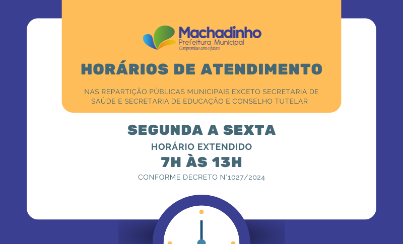 A Prefeitura de Machadinho publicou o Decreto nº 1.027/2024, que estabelece um horário especial de expediente para as repartições públicas municipais. O novo turno diferenciado entra em vigor a partir de 9 de outubro e segue até 31 de dezembro de 2024. O decreto foi assinado pelo prefeito Alcir Grison e visa otimizar o atendimento e os recursos públicos.