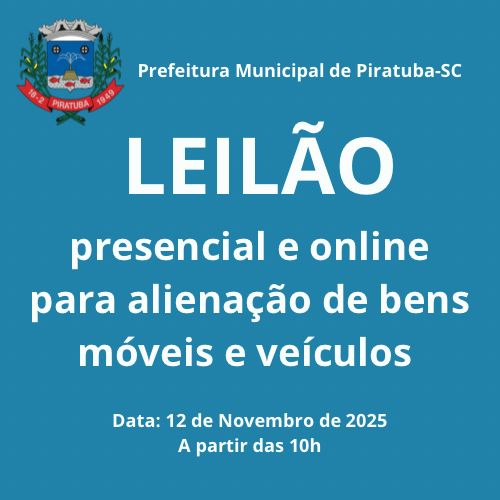 A Prefeitura de Piratuba realizará, no dia 12 de novembro de 2025, um leilão público de veículos e bens móveis, com o objetivo de otimizar o uso dos recursos municipais e dar destino adequado a materiais, veículos e máquinas que não estão mais em uso.