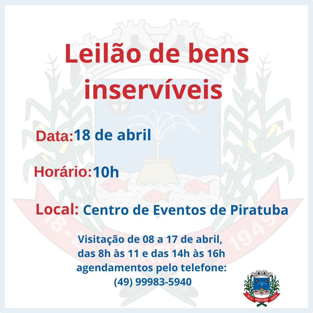 O leilão terá início às 10h e será no Centro de Eventos de Piratuba, localizado na Rua Florianópolis, nº 246, Piratuba.