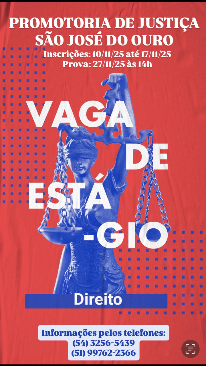 A Promotoria de Justiça de São José do Ouro anuncia a abertura do processo seletivo para estágio na área de Direito. As inscrições estarão abertas de 10 a 17 de novembro de 2025 e deverão ser realizadas exclusivamente de forma presencial, na sede da Promotoria, localizada na Rua Catarina Debastiani, nº 164, das 12h30min às 18h30min. Mais informações podem ser obtidas pelo telefone (54) 3216-5439.