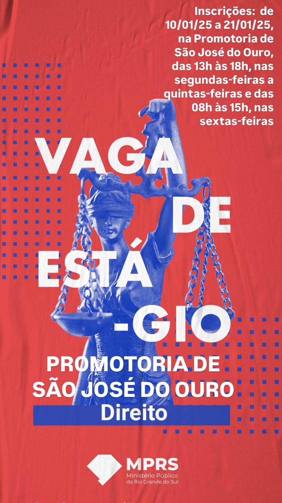 A Promotoria de Justiça de São José do Ouro anuncia a abertura de inscrições para o Processo Seletivo de Estágio destinado a estudantes do curso de Ciências Jurídicas e Sociais/Direito. Confira abaixo os principais detalhes: