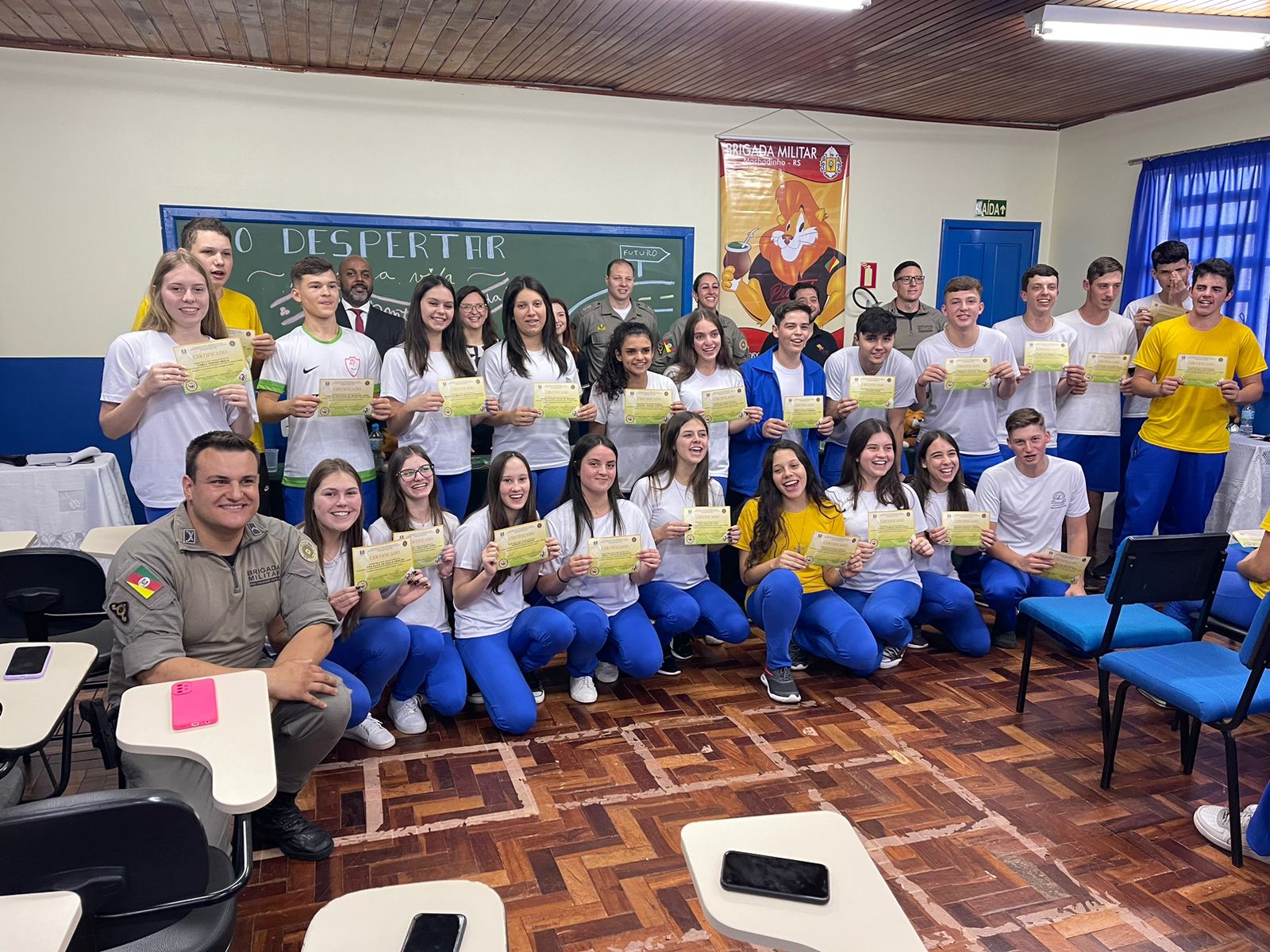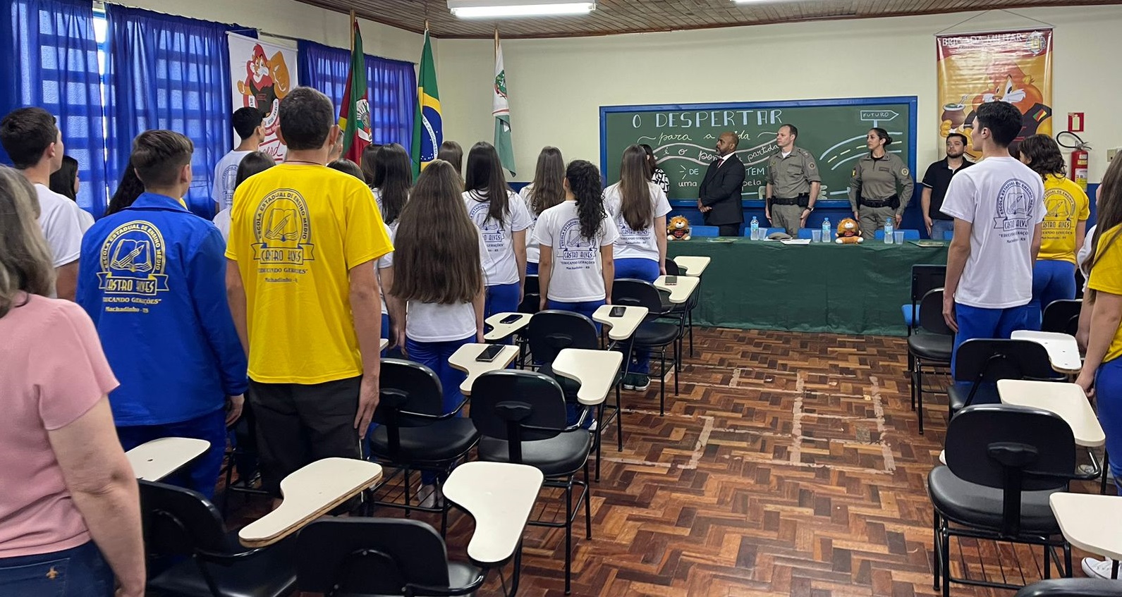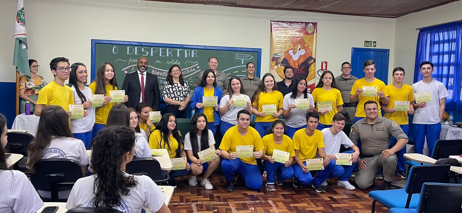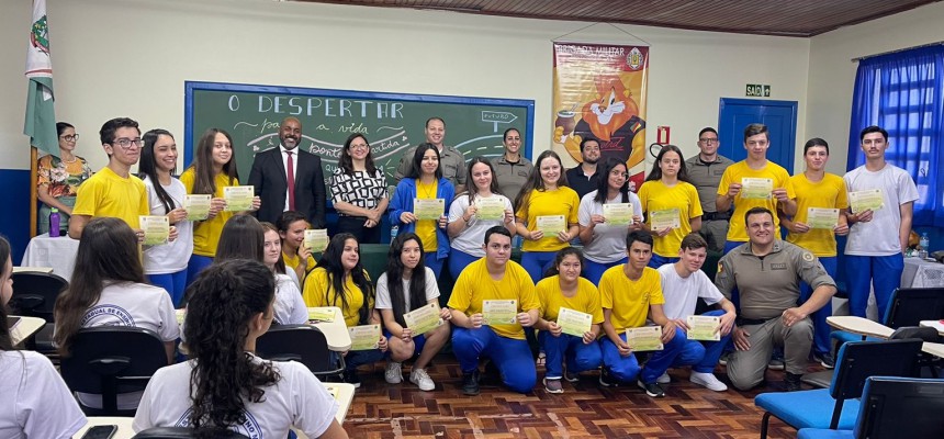 Foi realizada na manhã desta quinta-feira, 26 de outubro de 2023, a formatura do PROERD, que foi ministrado para 45 alunos da turma do 1º Ano, do Ensino Médio, turno da manhã, da Escola Estadual Castro Alves, de Machadinho. São alunos que estão na faixa etária de 16 anos e através do PROERD, já estão sendo preparados para o futuro; o qual, é sempre desafiador para os jovens, tendo em vista que as portas para as drogas, ou, para a criminalidade, estão sempre abertas.