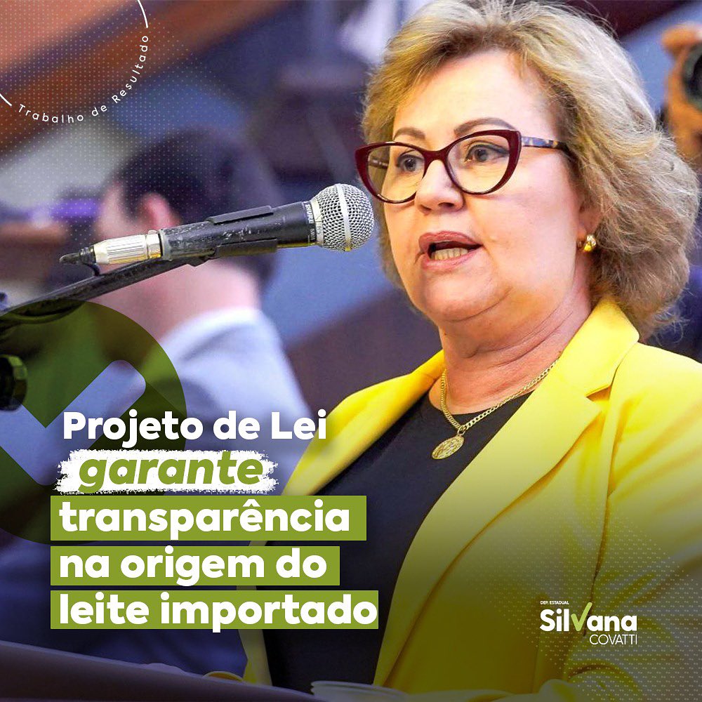 Para promover maior transparência na origem do leite importado, a Deputada Estadual do Partido Progressistas, Silvana Covatti, apresentou um projeto de lei, que obriga as indústrias de laticínios, a divulgar nos rótulos de seus produtos, quando estes forem produzidos com leite importado, detalhando o país de origem. Adicionalmente, deverão incluir a informação precisa: “Este produto utiliza leite importado.”