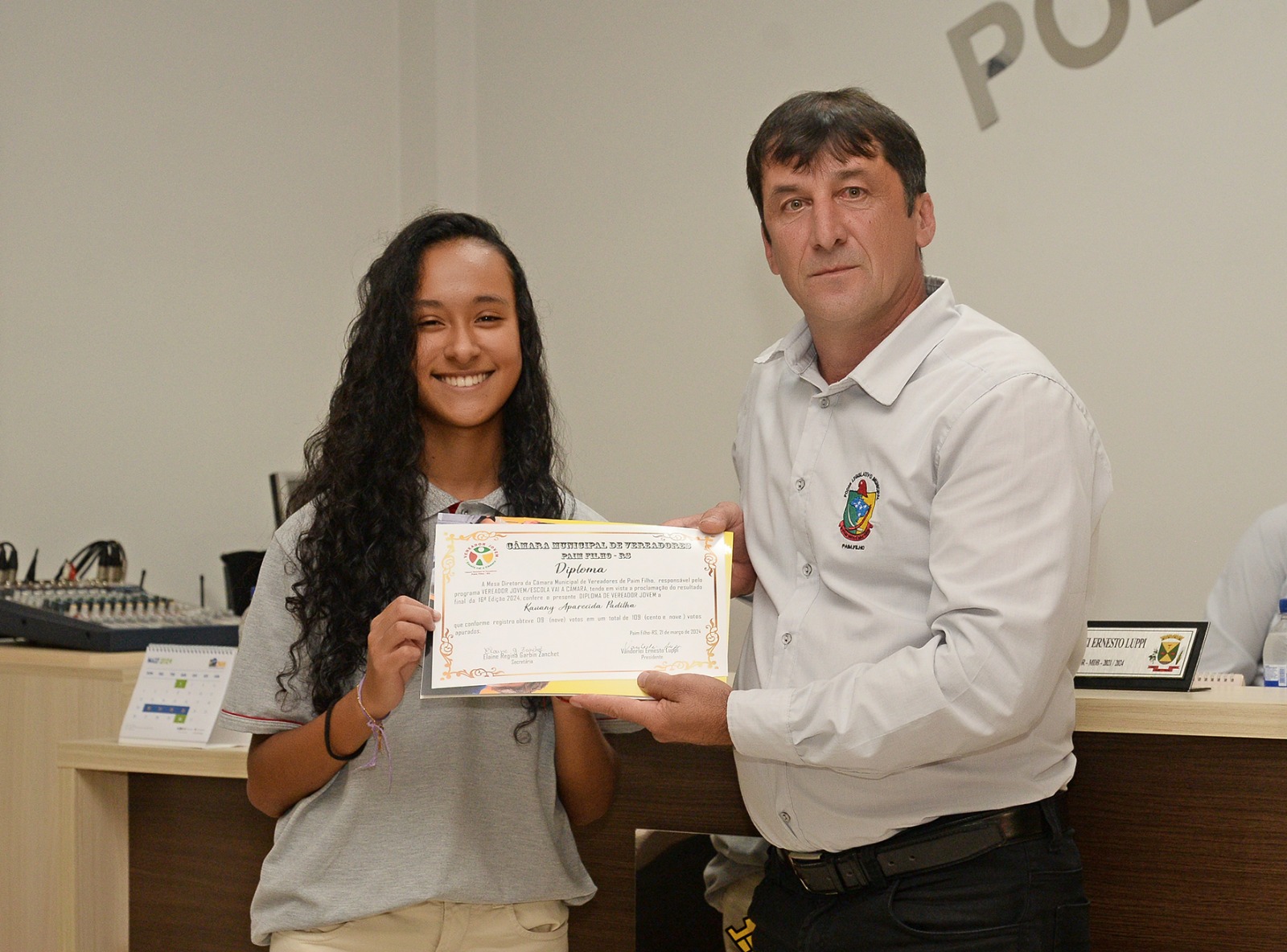 Na oportunidade, em virtude de não ter podido estar presente à Sessão Solene de Diplomação e Posse, Kauany Aparecida Padilha foi empossada pelo Presidente da Casa como Vereadora Jovem 2024.
