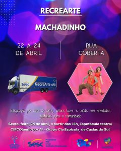 A Administração Municipal de Machadinho, por meio da Secretaria de Educação, com o apoio das demais secretarias e entidades municipais, recebe o projeto RecreArte do SESC-RS. A iniciativa traz ao município a unidade móvel do Sesc, que leva gratuitamente lazer e cultura aos municípios gaúchos, promovendo informação, conhecimento e o desenvolvimento integral da comunidade.