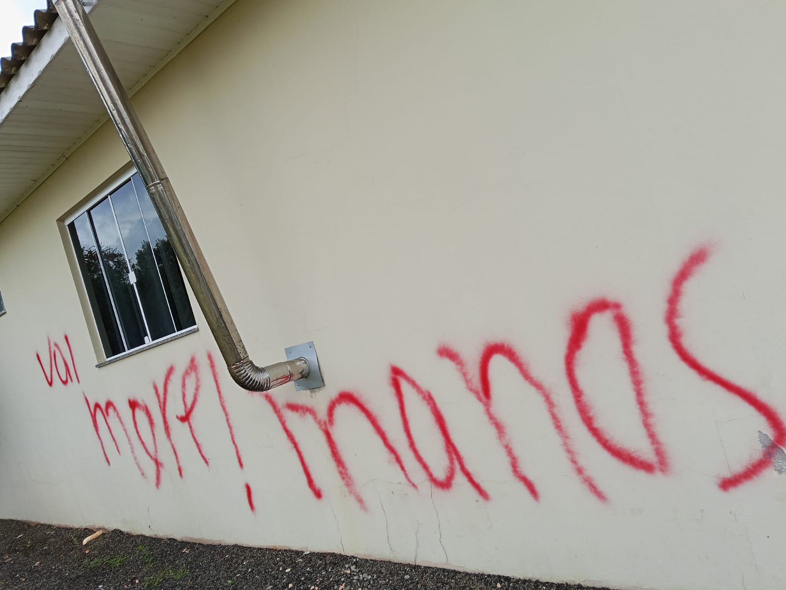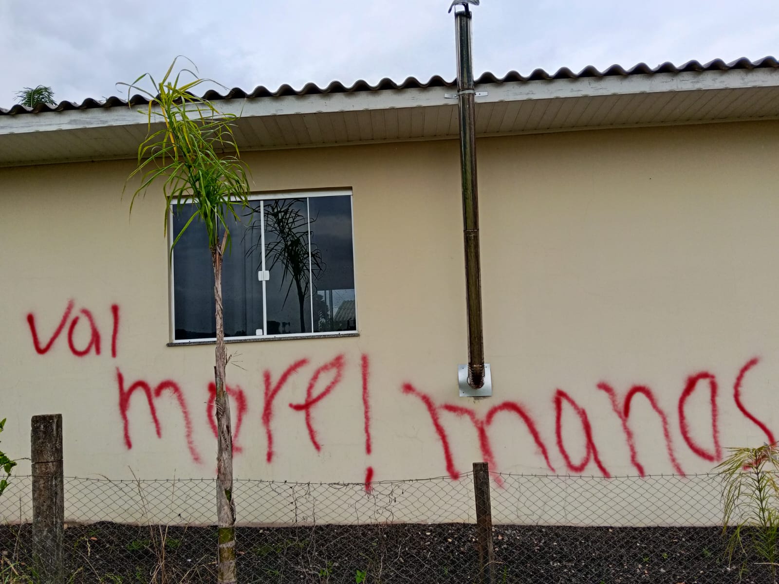 A frase registrada na parede — “Vai more! Manos” — além de apresentar erros gramaticais, deixou a família apreensiva pela conotação intimidatória.