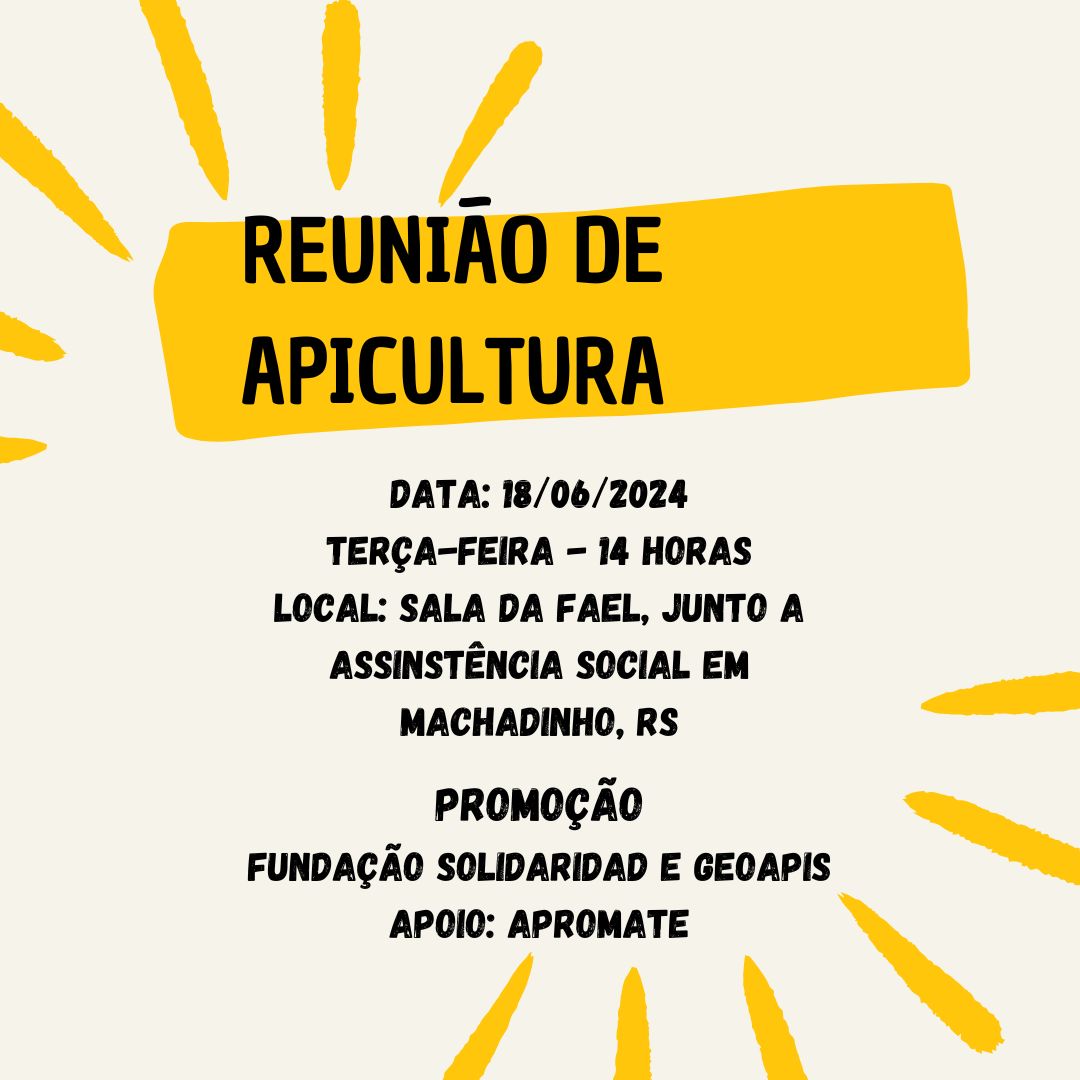 Apicultores e entusiastas da apicultura, são convidados para participarem da Reunião de Apicultura, promovida pela Fundação Solidaridad e GEOAPIS, com apoio da APROMATE. O evento será realizado em Machadinho, no dia 18 de junho, terça-feira, às 14h, na sala da FAEL, junto à assistência social do município.