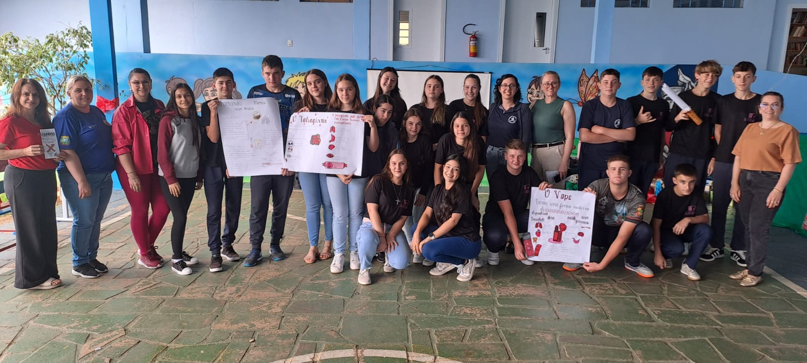 Para o encerramento, o tema central foi drogas, e os alunos foram desafiados a assumir o protagonismo: realizaram pesquisas, entrevistas e apresentaram reflexões construídas por eles mesmos, demonstrando maturidade e engajamento.