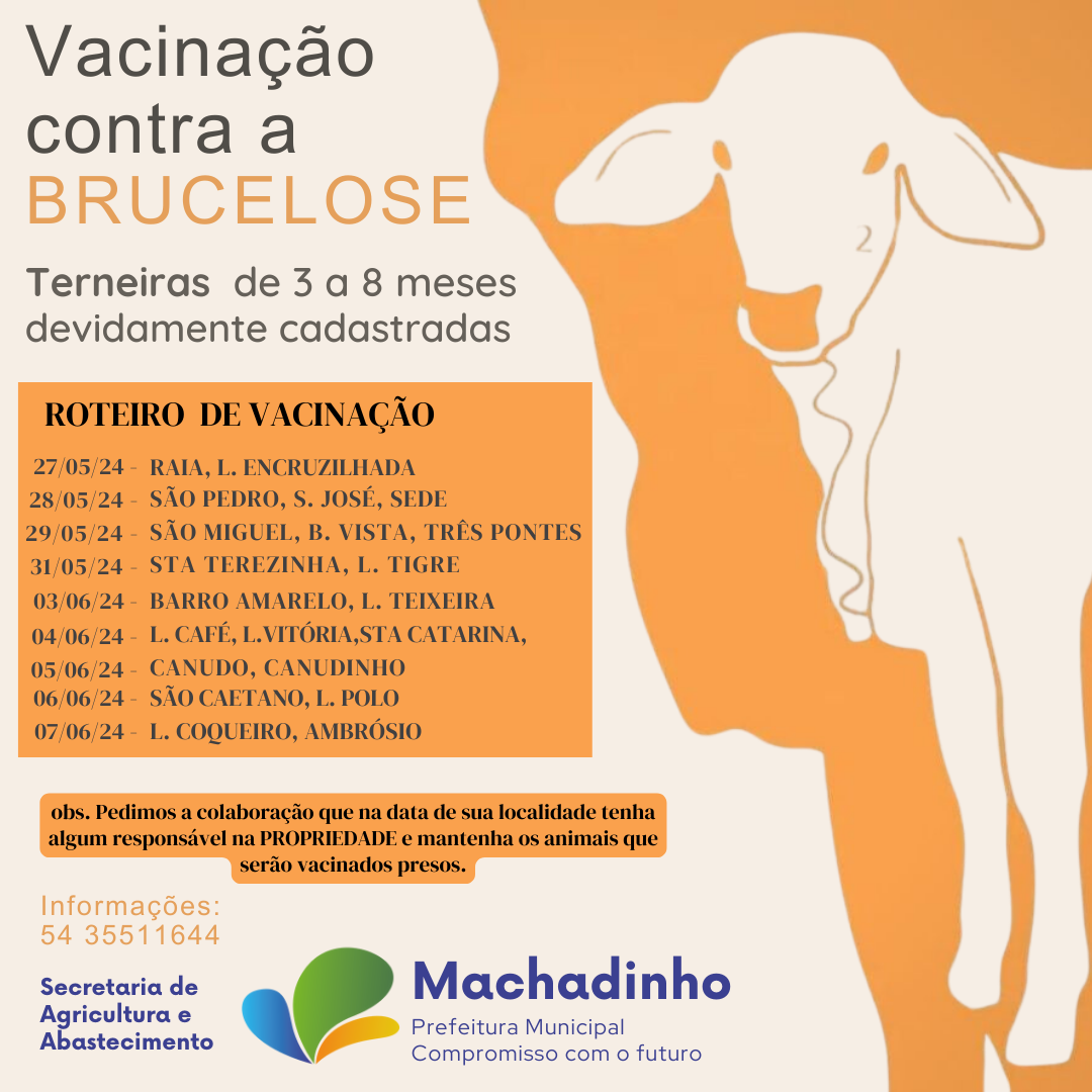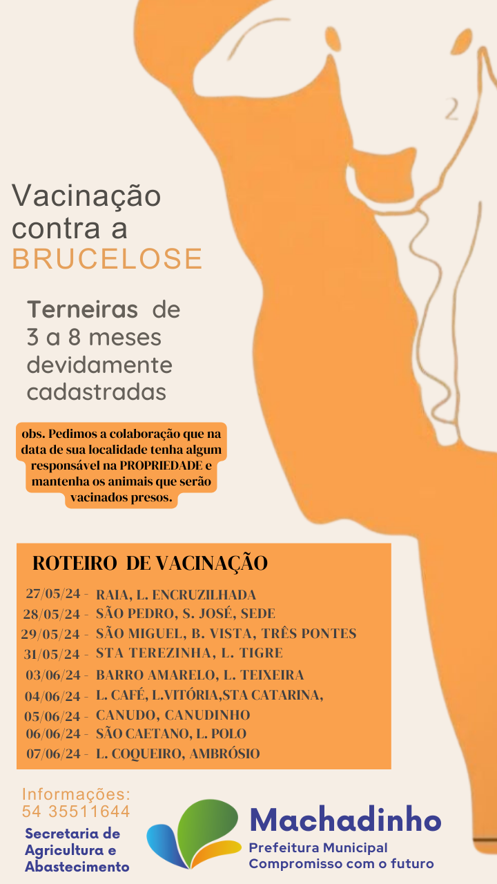 A Secretaria de Agricultura, Abastecimento e Meio Ambiente de Machadinho divulgou o calendário do roteiro de vacinação contra Brucelose para terneiras de 3 a 8 meses de idade. A vacinação será realizada entre os dias 27 de maio e 7 de junho de 2024, conforme o cronograma abaixo.