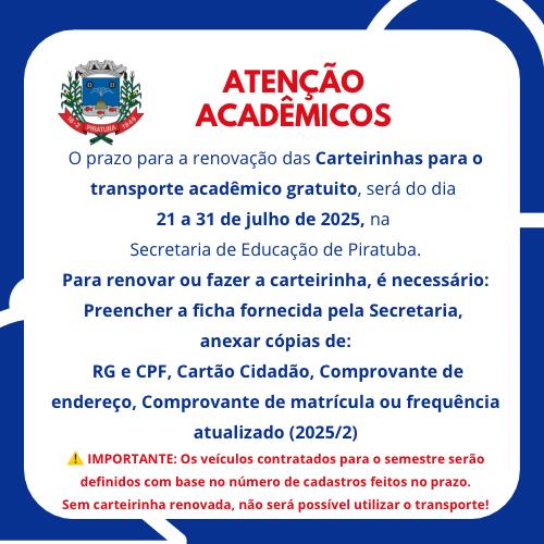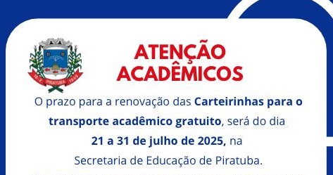 A Secretaria de Educação e Esportes de Piratuba anunciou que o processo de renovação e emissão da carteirinha de acadêmicos – documento necessário para o uso do transporte escolar gratuito oferecido a estudantes universitários e de cursos técnicos – acontecerá entre os dias 21 a 31 de julho de 2025.