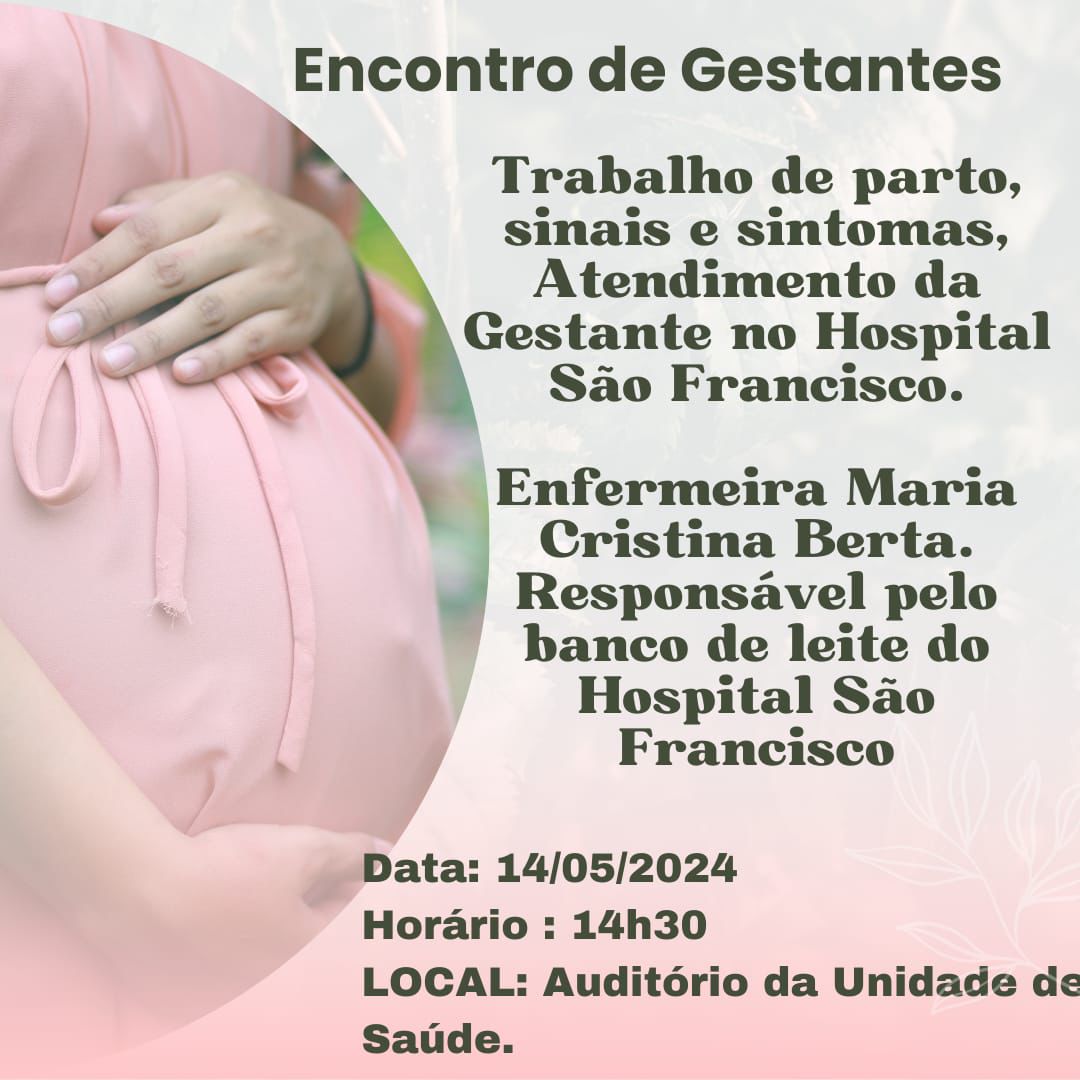 O encontro contará com a presença da palestrante Maria Cristina Berta, que é responsável pelo banco de leite do Hospital São Francisco, da cidade de Concórdia- SC, e tem como objetivo abordar o tema: “Trabalho de Parto, sinais e sintomas e o fluxo de atendimento a gestante no Hospital São Francisco”.
