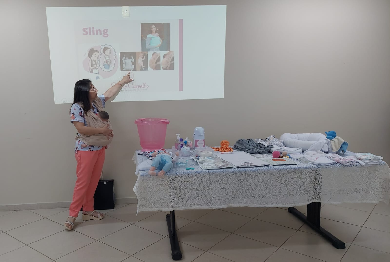 A palestra foi ministrada pela enfermeira Cirene Aparecida da Silva, com o tema os cuidados com o recém-nascido e focou na importância da rede de apoio após o nascimento do bebê. A enfermeira abordou ainda sobre os cuidados com o sono, banho, uso do bebê conforto com o objetivo de evitar acidentes domésticos.