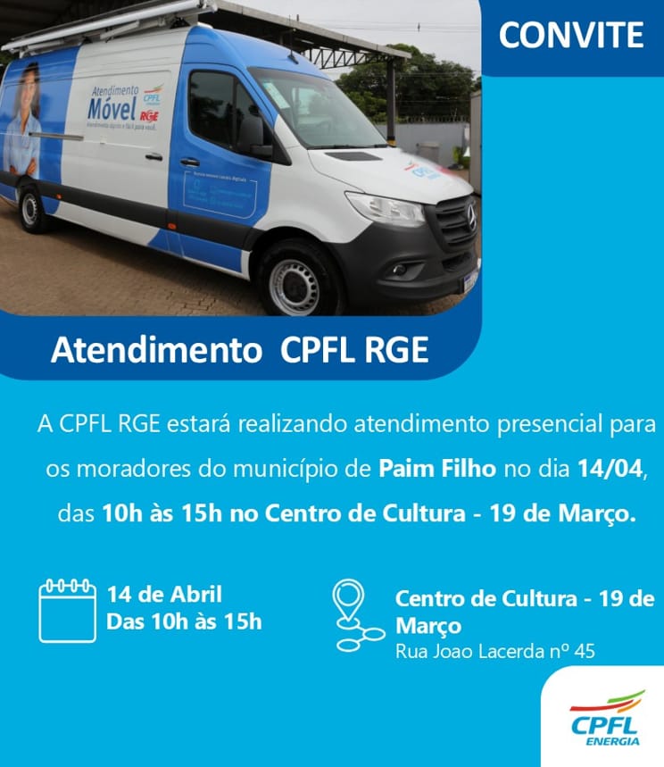 Os moradores de Paim Filho terão a oportunidade de acessar serviços presenciais da CPFL RGE na próxima terça-feira, dia 14 de abril.