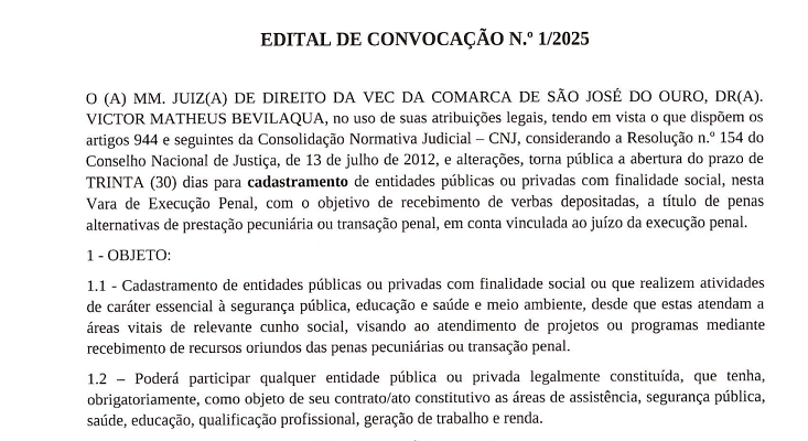 O Juiz de Direito da Comarca de São José do Ouro, Dr. Victor Matheus Bevilaqua, torna pública a abertura do prazo de 30 dias para o cadastramento de entidades públicas ou privadas com finalidade social, pertencentes à Vara de Execuções Penais de São José do Ouro. As entidades cadastradas poderão ser contempladas com verbas depositadas a título de penas alternativas, incluindo prestações pecuniárias e transações penais vinculadas ao juízo da execução penal.
