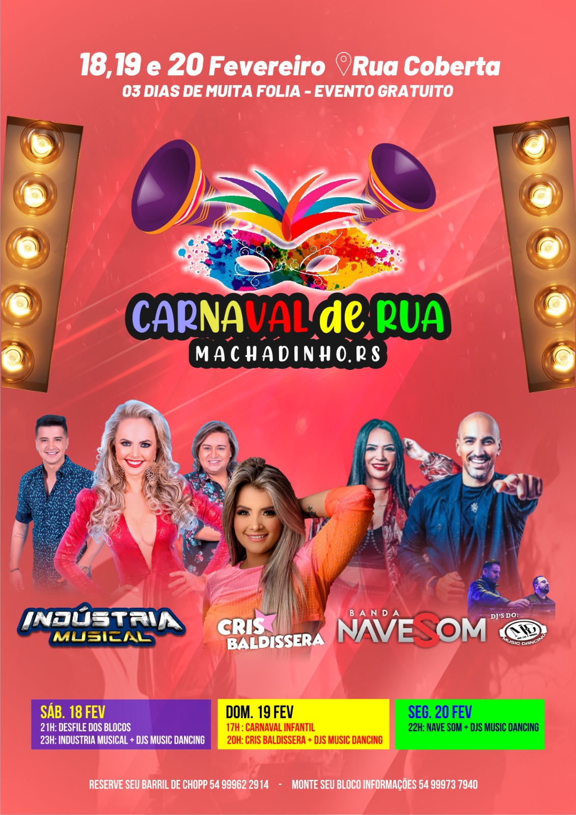Com três dias de festa, as programações iniciarão na sexta-feira (18) a partir das 21 horas, com desfile dos blocos de carnaval conduzidos por trio elétrico e carros alegóricos. Logo após haverá show musical com a Banda Indústria Musical. No domingo (19) será a vez das crianças. Uma tarde animada cheia de alegria e muita energia. A noite haverá show com Cris Baldissera e Djs do Music Dancing. Por fim a folia se encerra na segunda-feira (20) com mais um grande show musical animado pela Banda Nave Som.