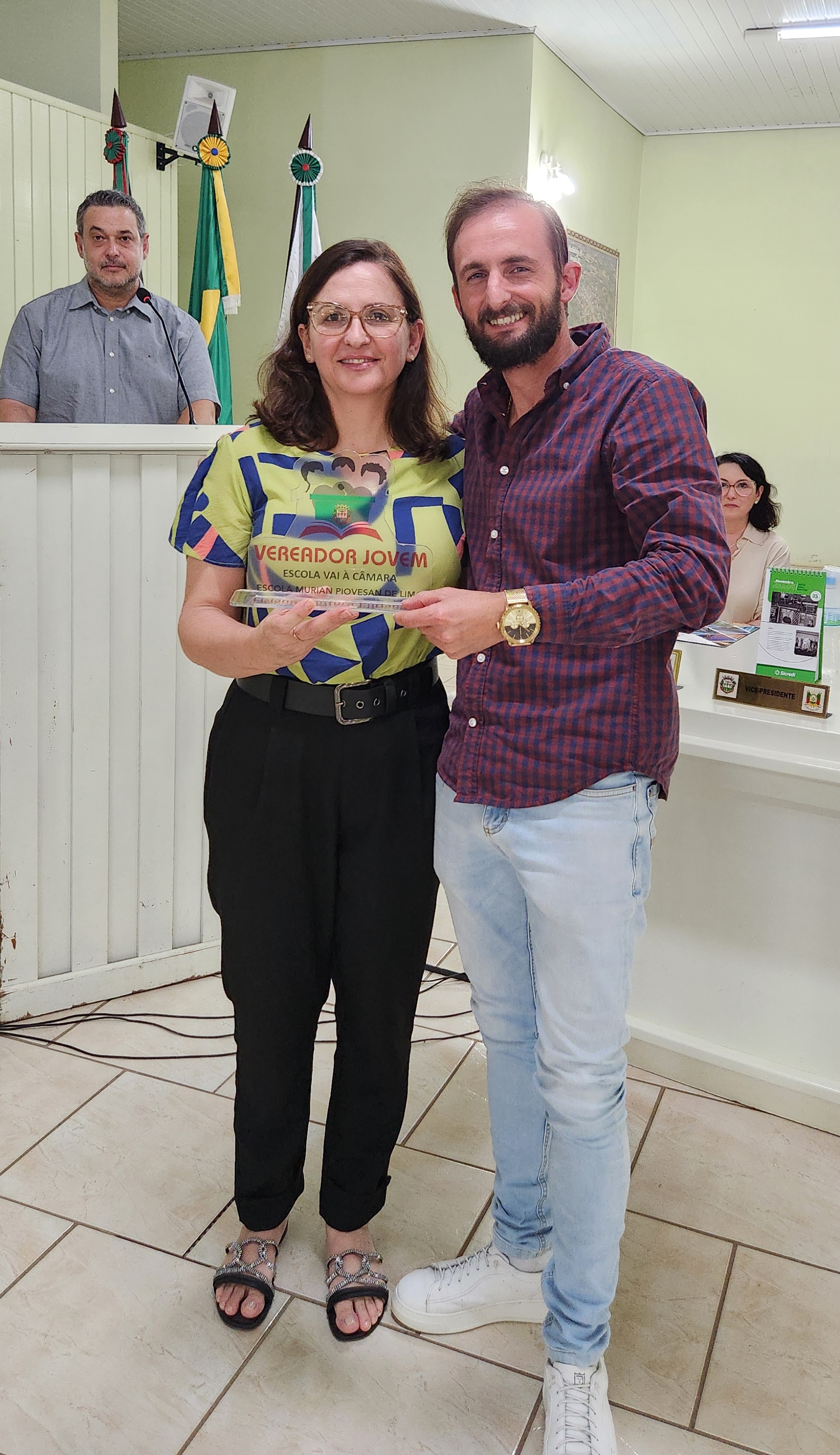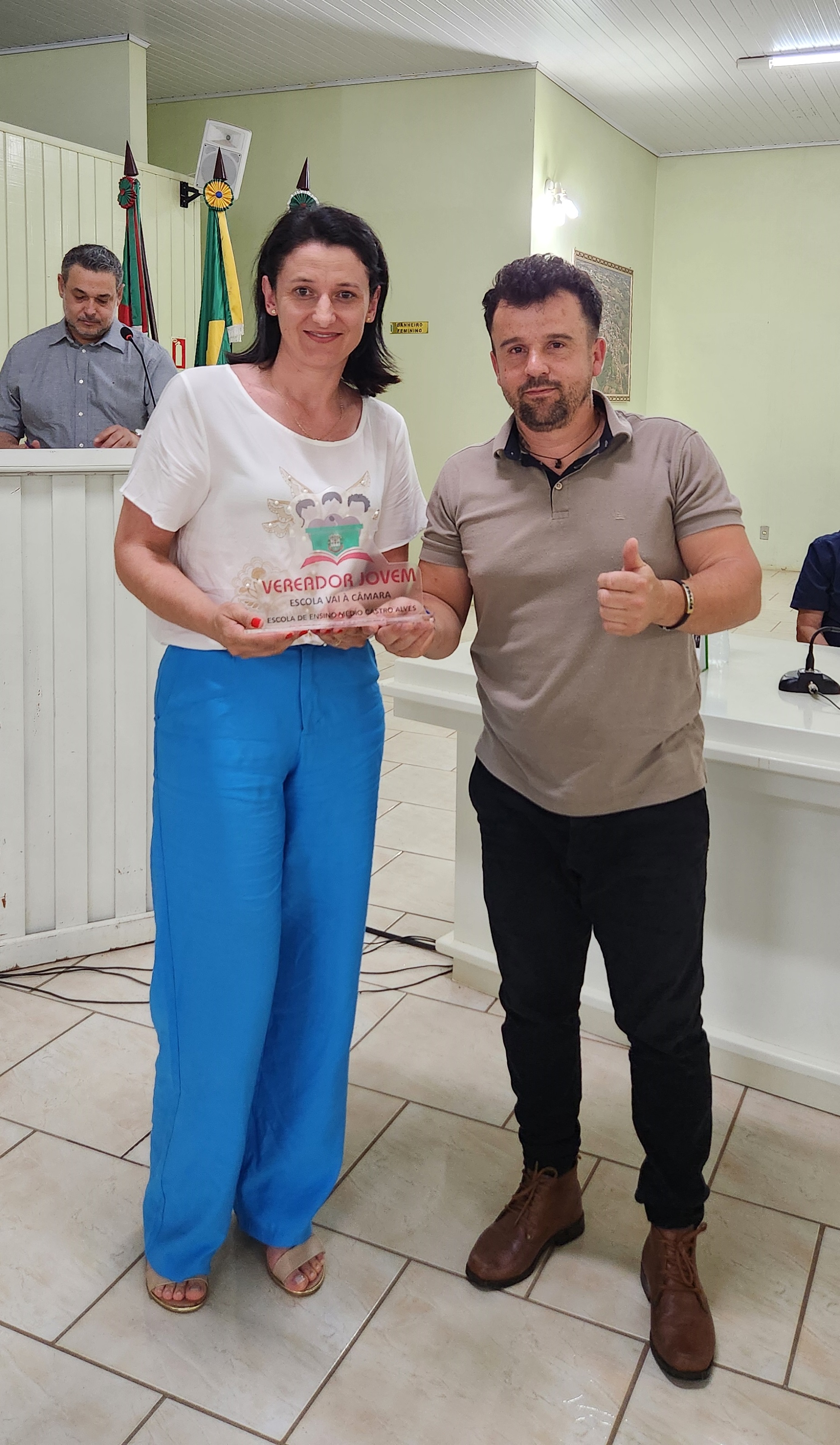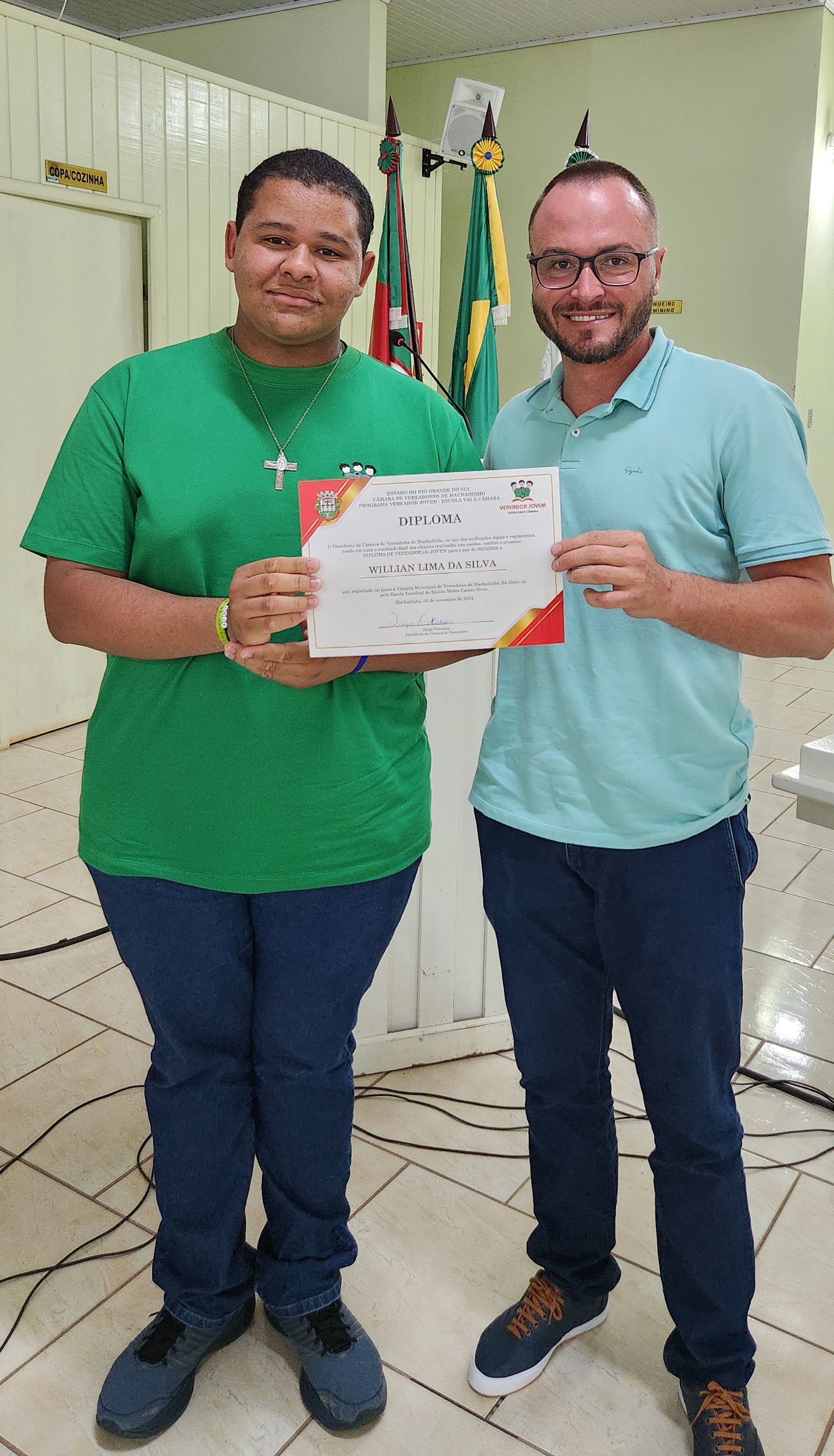 O programa, vai além de despertar o interesse pela política; seu objetivo é a formação de cidadãos conscientes, com pensamento crítico e ético, capazes de contribuir para uma sociedade mais justa e digna. Durante a solenidade, a mesa de honra foi composta pelo presidente da Câmara, Diego Pietrobon; o prefeito em exercício, Dorival de Lima Vilarino; a secretária de Educação, Leoni Pelicer Schwaab; a coordenadora pedagógica da Escola Murian, professora Graciela Camel; a diretora da Escola Castro Alves, Lisiane Ventura Furlanetto; e Professora Caren Brandão, representante do projeto na Escola Castro Alves.