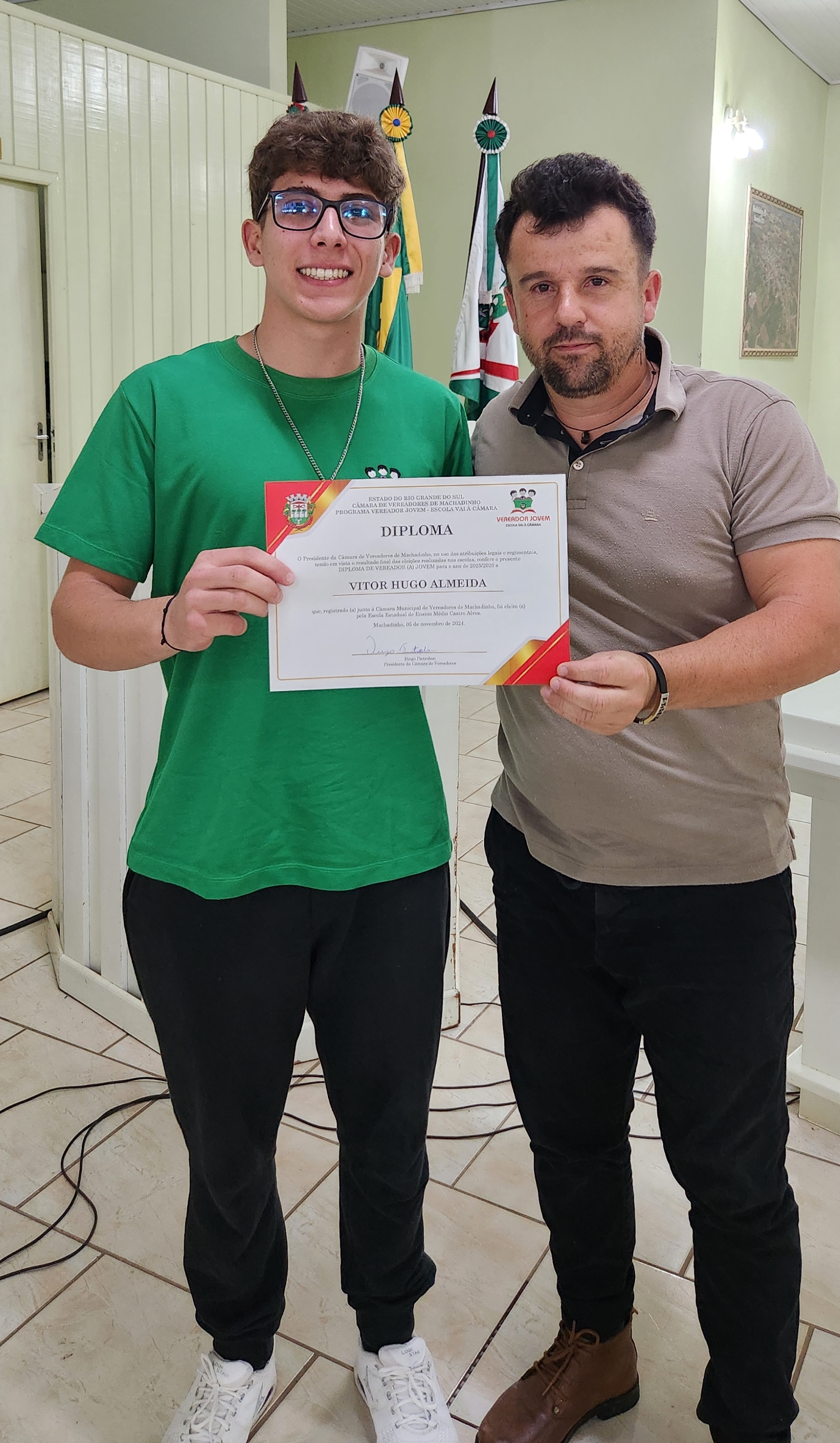 Na noite da terça-feira, 05 de novembro de 2024, a Câmara de Vereadores de Machadinho realizou uma sessão ordinária, seguida de uma sessão solene, de grande relevância: a Diplomação dos jovens eleitos para o programa Vereador Jovem, projeto de autoria da vereadora Profe Jusse. O programa, denominado “Vereador Jovem/Escola Vai à Câmara“, teve sua criação aprovada pela Lei Municipal nº 012-2022 e posteriormente, regulamentada por uma resolução que estabeleceu seu regimento interno. Este é um projeto pioneiro em Machadinho, sendo desenvolvido em parceria com a Escola Estadual de Ensino Médio Castro Alves e a Escola Municipal Murian Piovesan de Lima. A primeira edição do programa, envolve a Câmara, educadores, estudantes e famílias, em um esforço conjunto para incentivar uma cidadania participativa e engajada.