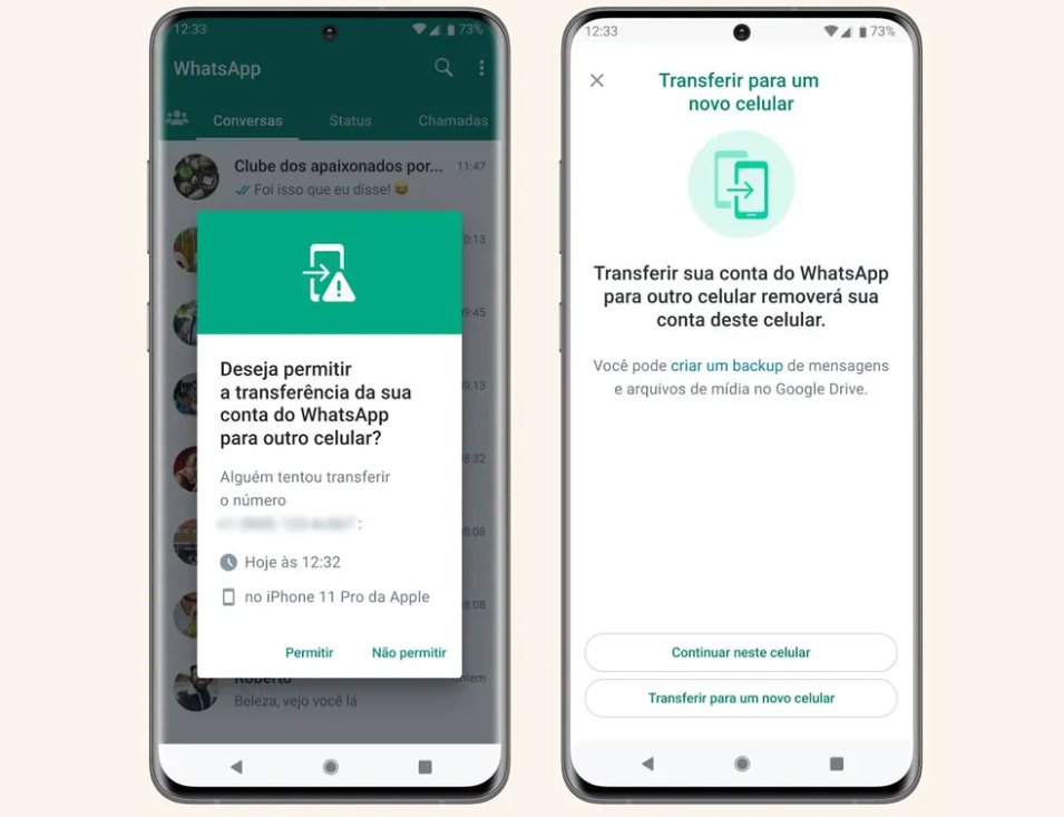 O alerta vai exibir o horário e em qual modelo de celular aconteceu a tentativa de transferência. Além disso, o aplicativo vai explicitar que a transferência remove totalmente a conta do celular antigo. Os usuários, por sua vez, poderão permitir ou não a migração.