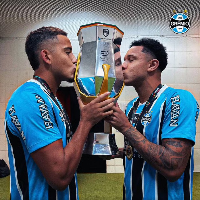Depois do jogo, já no vestiário, o zagueiro também repetiu uma imagem muito marcada na memória recente dos gremistas. A dupla de zaga formada em casa beijou a taça do Gauchão e registrou o momento, como uma referência a Geromel e Kannemann, que geraram essa tradição desde o tÃtulo da Copa do Brasil, em 2016, com Conmebol Libertadores, Recopa Sul-Americana e outros Gauchões.